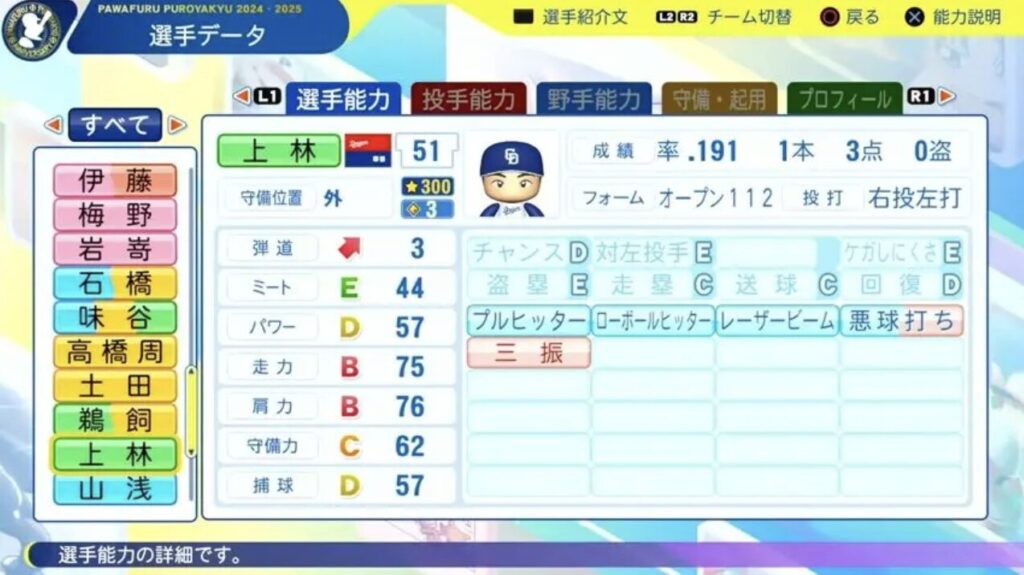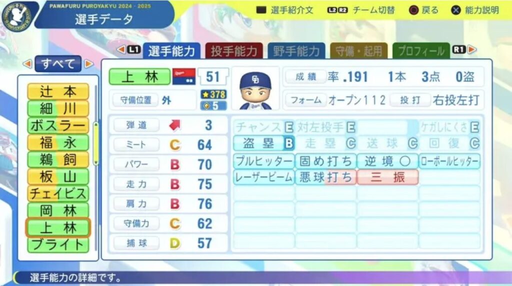 パワプロ11月20日第14回アップデートが行われました。2025年終了時のデータが反映されています。今回は上林選手です。