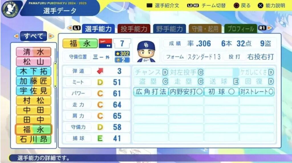 パワプロ11月20日第14回アップデートが行われました。2025年終了時のデータが反映されています。今回は福永選手です。