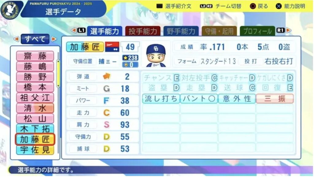 パワプロ11月20日第14回アップデートが行われました。2025年終了時のデータが反映されています。今回は加藤匠選手です。