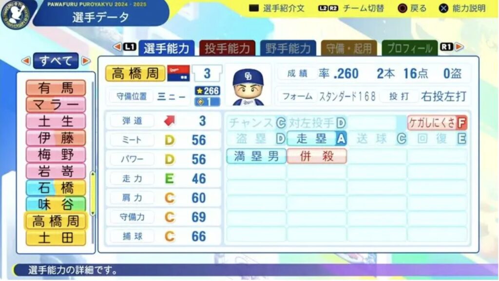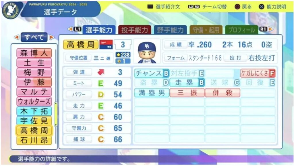 11月20日第14回アップデートが行われました。2025年終了時のデータが反映されています。今回は高橋周平選手です。