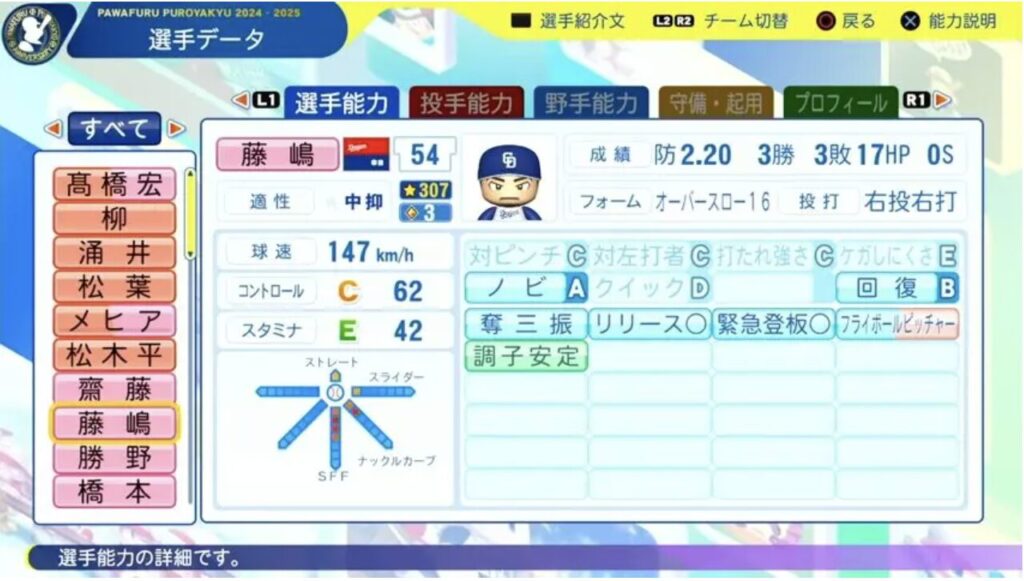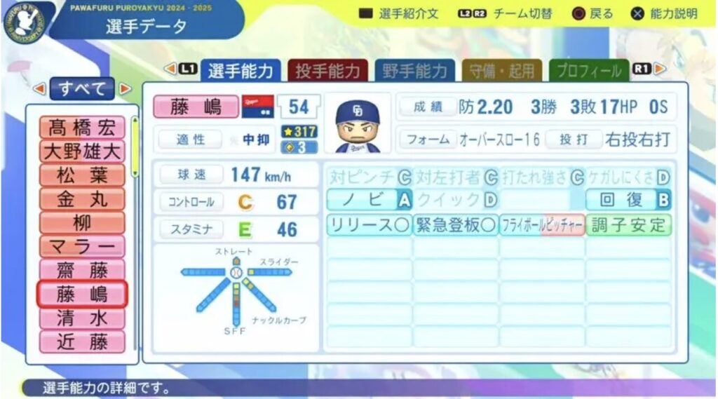 パワプロ11月20日第14回アップデートが行われました。2025年終了時のデータが反映されています。今回は藤嶋選手です。