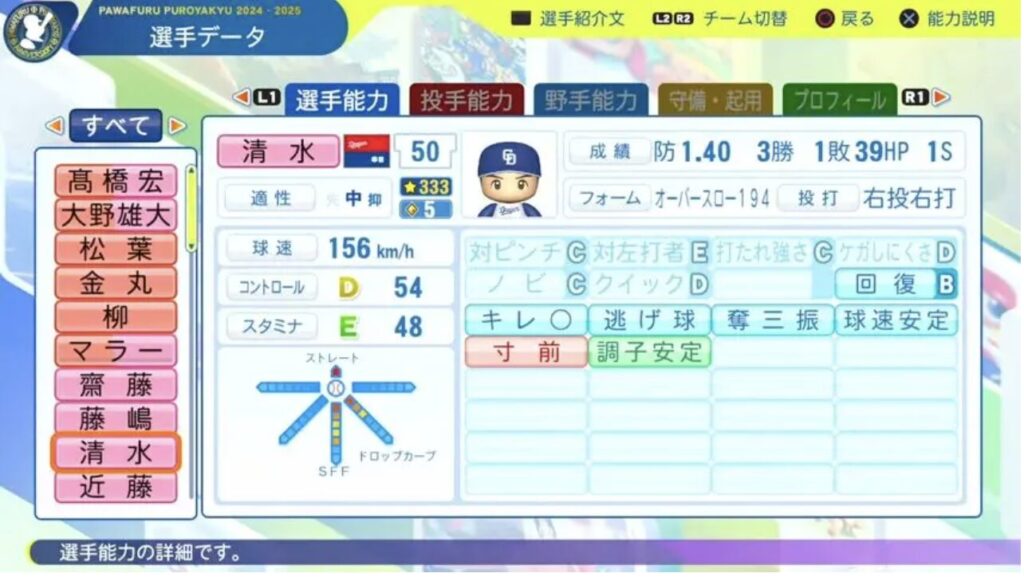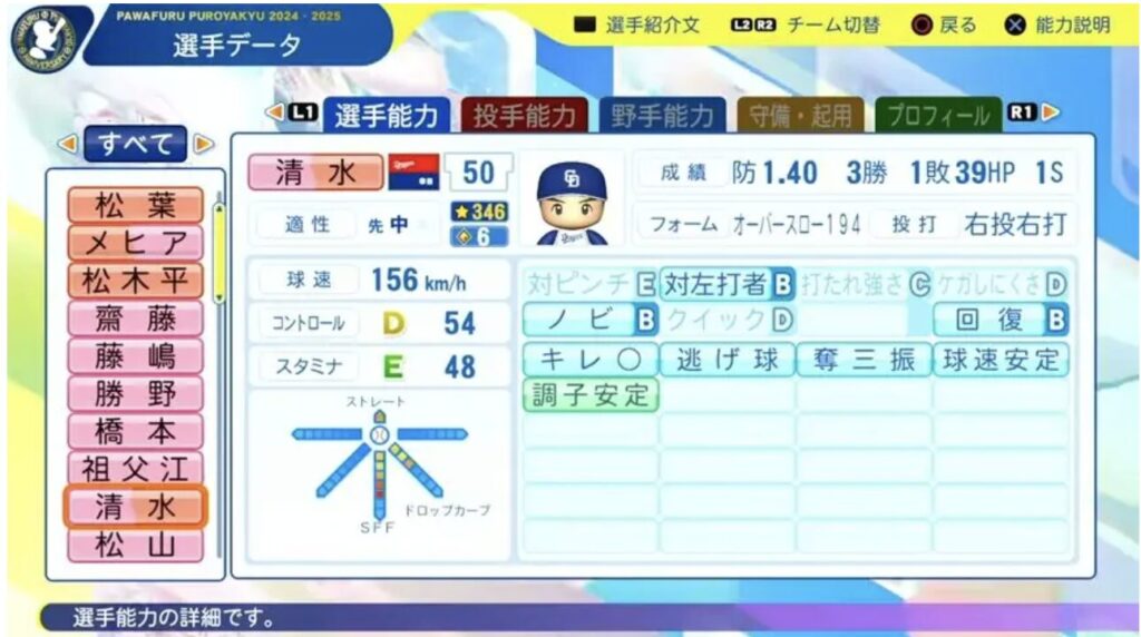 パワプロ11月20日第14回アップデートが行われました。2025年終了時のデータが反映されています。今回は清水選手です。
