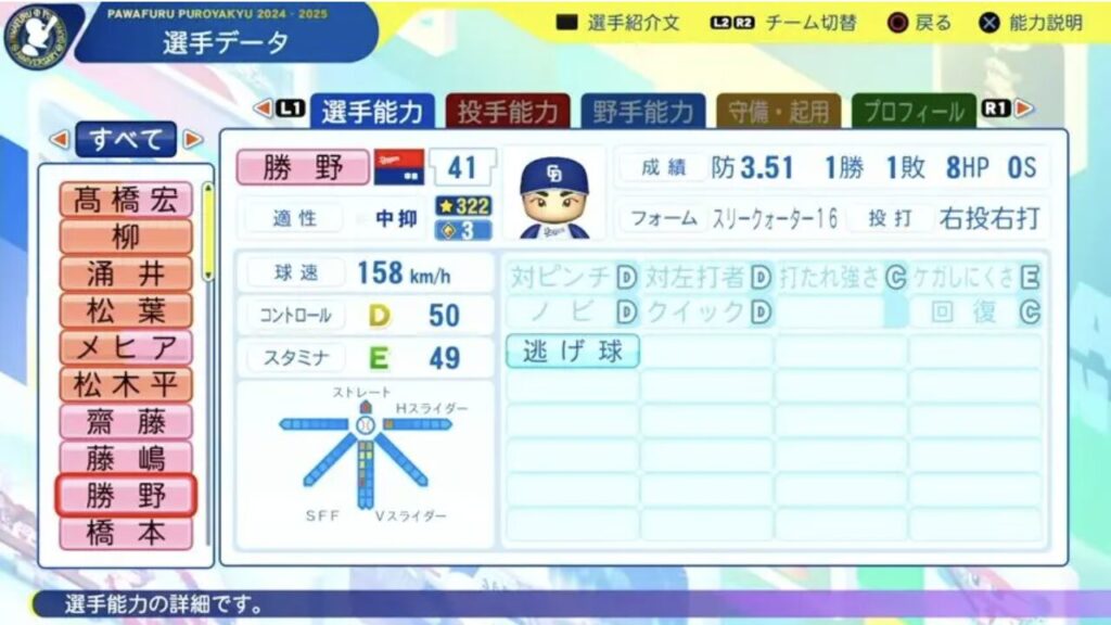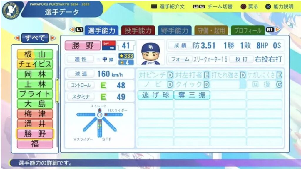 パワプロ11月20日第14回アップデートが行われました。2025年終了時のデータが反映されています。今回は勝野選手です。