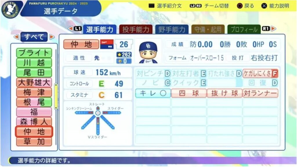 11月20日第14回アップデートが行われました。2025年終了時のデータが反映されています。今回は仲地選手です。