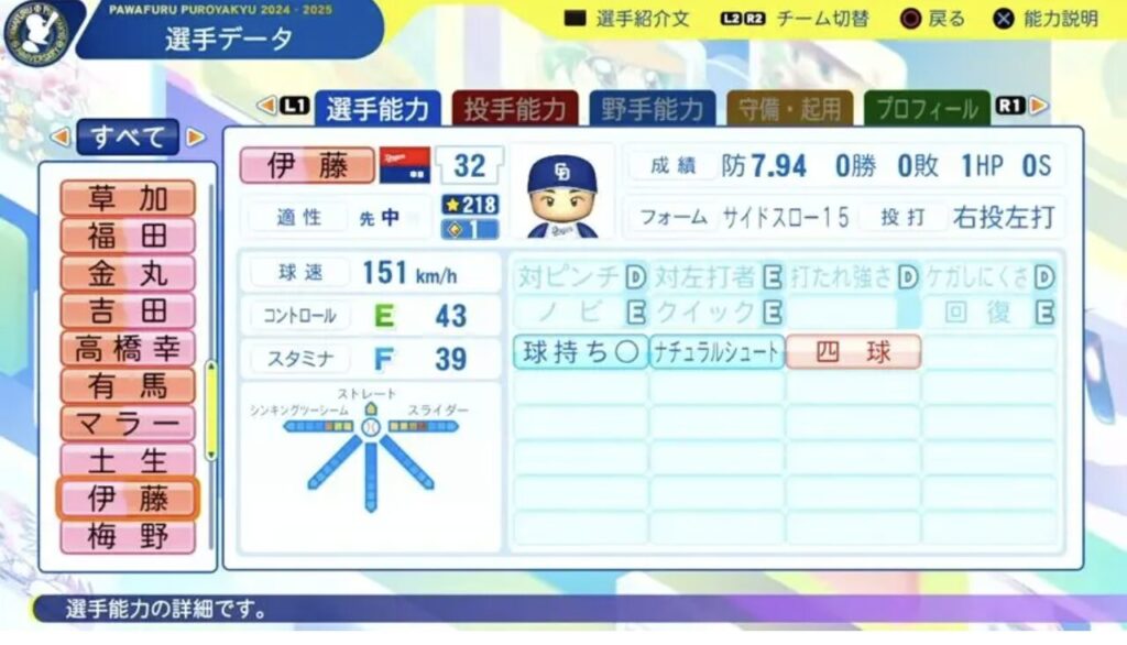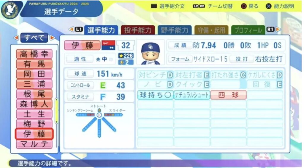 パワプロ11月20日第14回アップデートが行われました。2025年終了時のデータが反映されています。今回は伊藤選手です。