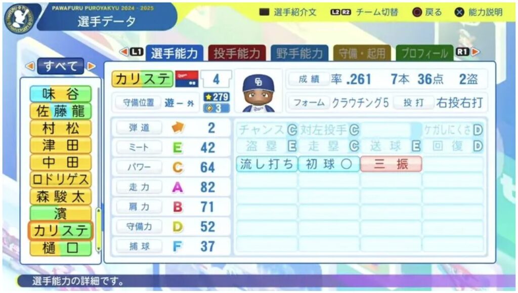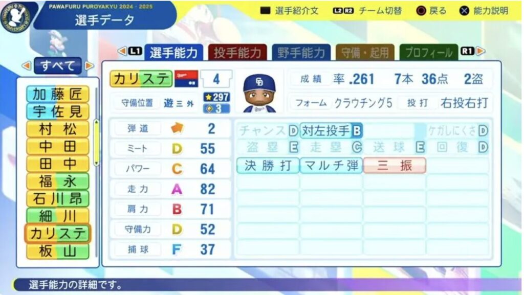 パワプロ11月20日第14回アップデートが行われました。2025年終了時のデータが反映されています。今回はカリステ選手です。